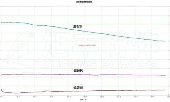 為更加清楚地闡述粉體對流體流變特性影響,如下為流變儀展現的,不同種類粉體的膠粘劑流變特性。以下為800目滑石粉、碳酸鈣、硫酸鋇流變特性對比情況: