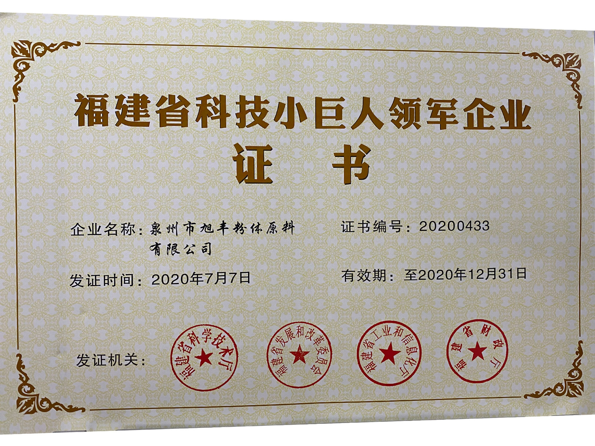日前,福建省科學技術廳公布2020年科技小巨人領軍企業新增培育名單,旭豐粉體企業有幸入選,被列入“科技小巨人領軍企業培育發展庫”,并正式授予“福建省科技小巨人領軍企業”榮譽證書。